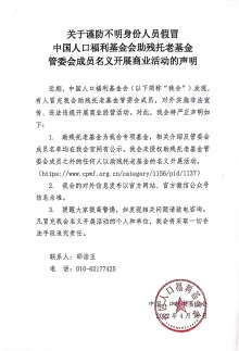 關于謹防不明身份人員假冒中國人口福利基金會助殘托老基金管委會成員名義開展商業活動的聲明