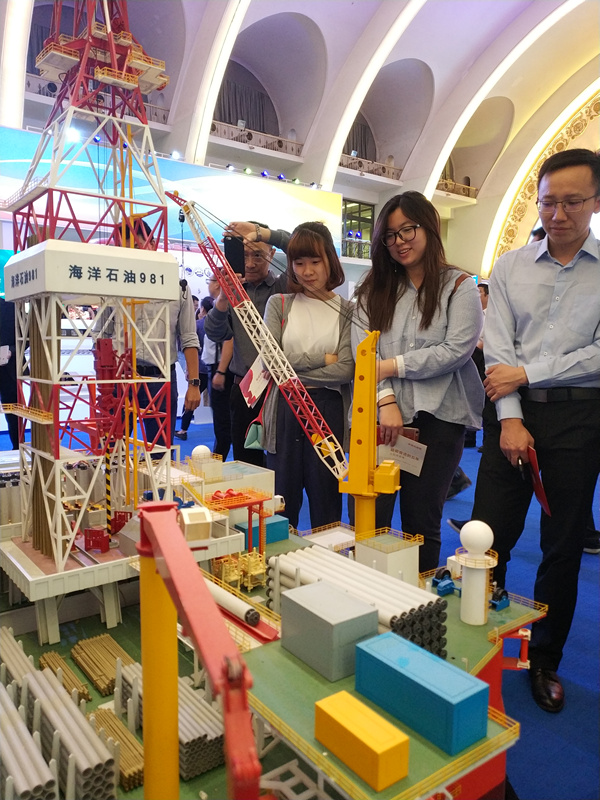 認(rèn)真參觀海洋鉆井平臺(tái)模型