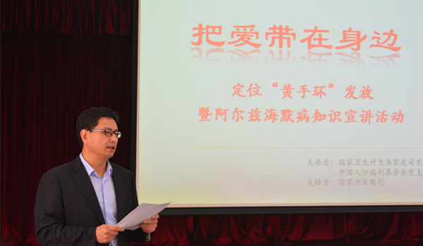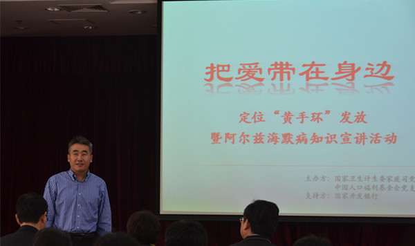 News2017年10月27日下午,“把愛帶在身邊——黃手環(huán)發(fā)放暨阿爾茨海默病知識宣講活動”在國家衛(wèi)生計生委3號樓1001會議室舉行。委家庭司司長王海東出席活動并講話,我會副秘書長趙本志發(fā)表致辭,中國中醫(yī)科學院西苑醫(yī)院老年病科主任、教授劉征堂進行阿爾茨海默病知識輔導。委家庭司副司長莫麗霞、我會國內項目部部長劉麗容以及委部分司局干部參加活動。