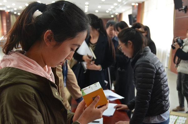領取定位黃手環(huán)的家屬正在查看介紹