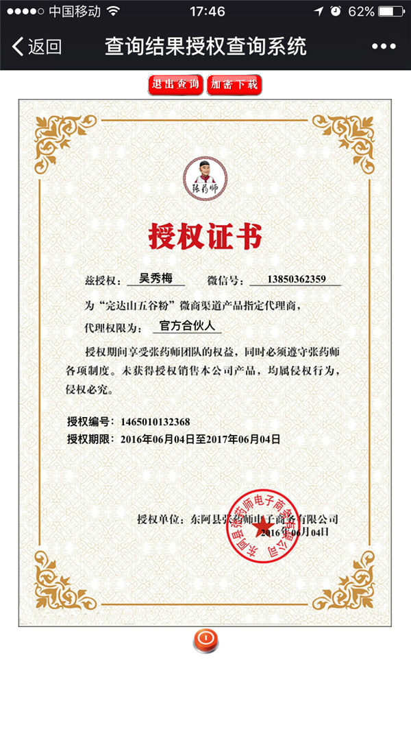 吳秀梅獲得“張藥師阿膠糕”官方合伙人和指定代理商授權證書