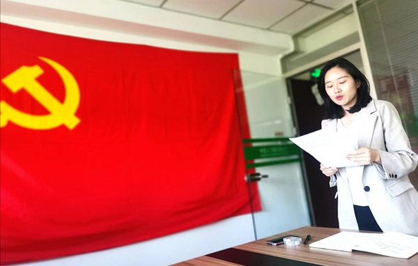 支部書記郝林娜為新黨員佩戴黨徽