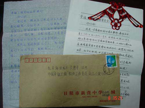 幫助困境母親,建設幸福家庭圖一:山東省日照市新營中學老師和同學們的來信 圖二:觀眾匯款單的復印件 圖三:給捐贈者的收據