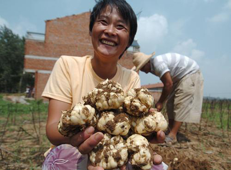 圖一、安徽省來安縣半塔鎮(zhèn)貧困母親黃友燕(前)種植的15畝百合喜獲豐收