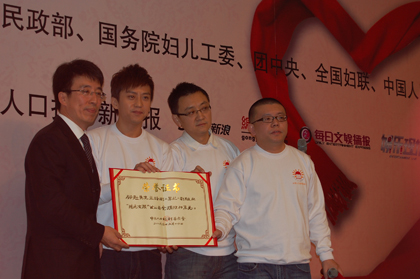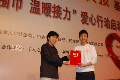 中國人口福利基金會秘書長楊文莊為“翠花劇組”頒發捐贈證書