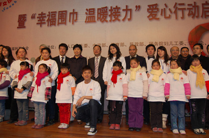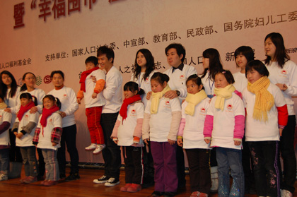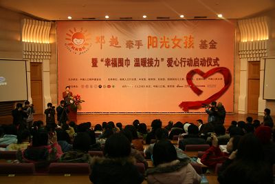 2009 年 12 月 16 日 ,由中國人口福利基金會主辦,國家人口計生委、中宣部、教育部、民政部、國務院婦兒工委、團中央、全國婦聯、中國人民大學等單位支持的《鄧超牽手陽光女孩基金暨“幸福圍巾·溫暖接力”愛心行動啟動儀式》在北京中國人民大學逸夫第一報告廳舉行。國家人口計生委、教育部、民政部、國務院婦兒工委、團中央、全國婦聯、中國人民大學的領導,北京八所高校的志愿者團隊代表,新聞媒體及部分愛心人士出席了啟動儀式。影視明星鄧超牽手“陽光女孩”,出任基金形象代言人,并代表話劇《翠花》劇組向“陽光女孩”基金捐款 10 萬元人民幣,同時,《人之初》雜志也向陽光女孩基金捐款 10 萬元。“幸福圍巾·溫暖接力”活動作為“陽光女孩”基金首次公益活動同時啟動。