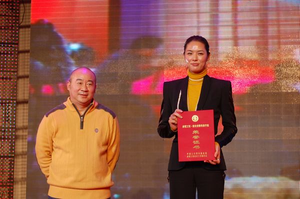 幸福工程形象大使馬艷麗為拍得《荷花》的羅杰先生頒獎(jiǎng)