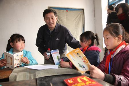 駱駝山溝小學(xué)帶領(lǐng)24個(gè)學(xué)生的張老師在高興地翻閱送到的書籍