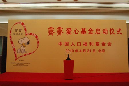 幫助困境母親,建設(shè)幸福家庭2010 年 4 月 21 日 ,由霽霽企業(yè)( SNOOPY 史努比亞太地區(qū)授權(quán)商)發(fā)起, 中國人口福利基金會主辦的霽霽愛心基金啟動儀式在北京人民大會堂舉行。