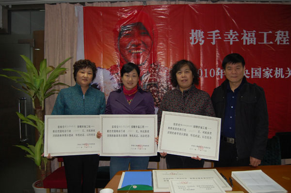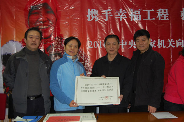 幫助困境母親,建設幸福家庭2010年中央國家機關向幸福工程捐款(右一為基金會秘書長楊文莊)