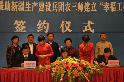 簽約儀式上,新疆兵團計生協宋建業會長介紹了兵團有關情況,吳玉新副會長介紹了兵團開展幸福工程工作情況,受助的農三師四十八團計生協負責同志匯報了項目籌建工作。上海市計生協、新疆兵團計生協、農三師計生協、四十八團計生協四方共同簽署了幸福工程項目協議書。