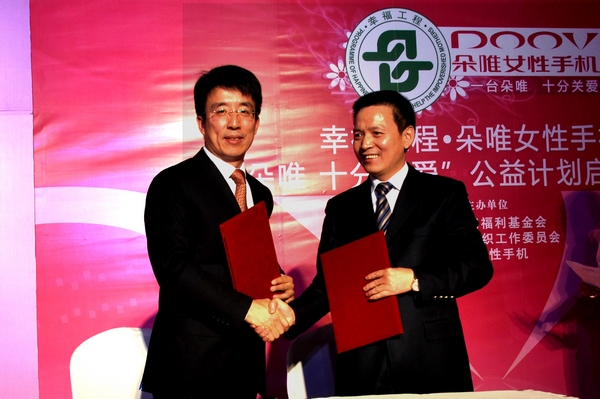 朵唯 2009 年與我會建立戰略合作伙伴關系。在國慶 60 周年當天,朵唯公司舉行了“美在朵唯、愛傳中國”義賣活動,并將義賣善款捐贈“幸福工程”。又出資百萬元拍攝“幸福工程”公益宣傳片,在全國百余家電視臺播放,號召全社會共同關注貧困母親。