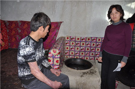 首先考察了沙雅縣托衣堡鎮(zhèn)園藝場(chǎng)二組古麗拜克然木·吐尼牙孜家。古麗拜克然木,女, 15 歲。三歲時(shí),由于煤油燈爆炸,致使面部嚴(yán)重?zé)齻km然學(xué)習(xí)成績(jī)很好,她也很渴望去讀書(shū),但是當(dāng)升入初中后,校方以面部毀容面積過(guò)大為理由,勸其退學(xué)。說(shuō)到這些,古麗拜克然木留下了傷心的淚水。她的父母將大部分的積蓄用面部整形上,截止現(xiàn)在已經(jīng)做了 2 次大型的整形手術(shù),花費(fèi)近 7 萬(wàn)元。現(xiàn)在古麗拜克然木很少出去和朋友們?nèi)ネ妗D樕狭粝碌膫倘匀缓芡础L鞖馓珶峄蜻^(guò)冷,臉上都會(huì)不舒服。古麗拜克然說(shuō)爸爸媽媽答應(yīng)還要給她做手術(shù),她也希望我們能夠幫幫她。其次,考察組訪談了阿里木·艾買(mǎi)提。他今年 19 歲。 3 歲時(shí),他從炕上掉入鍋內(nèi),將右手和肘關(guān)節(jié)嚴(yán)重?zé)齻V两裼沂诌€無(wú)法用力,家庭貧困也沒(méi)能做手術(shù)。聽(tīng)說(shuō)我們來(lái)考察,阿里木和他們的家人熱切盼望我們能提供免費(fèi)的手術(shù)。阿里木媽媽說(shuō),孩子已經(jīng)到了成家的年齡。他們準(zhǔn)備把給孩子結(jié)婚的錢(qián)拿出來(lái)支付治療費(fèi)用。最后,考察組對(duì) 10 歲的姚龍龍一家進(jìn)行了采訪拍攝。據(jù)龍龍媽媽講,孩子 10 個(gè)月時(shí)天冷,家里第一次生火取暖,龍龍才開(kāi)始爬。媽媽在院子里干活,比龍龍大 6 歲的姐姐在照顧他,因?yàn)橐粫r(shí)疏忽,龍龍爬到了爐子上,將小手燙的發(fā)黑。經(jīng)過(guò)搶救,龍龍的手保住了,但是手無(wú)法負(fù)力,到現(xiàn)在也抓不住籃球。據(jù)龍龍父親介紹,孩子已經(jīng)在烏魯木齊做了 4 次手術(shù),光治療費(fèi)已經(jīng)花去了近 5 萬(wàn)元。至今,龍龍的手還是伸不開(kāi),還需要不斷的手術(shù)。因手指需要打鋼針,每次 4-5 小時(shí)的麻醉,讓孩子非常痛苦。提到孩子承受的巨大磨難,龍龍的母親泣不成聲。通過(guò)當(dāng)?shù)赜?jì)生協(xié)開(kāi)展的摸底調(diào)查,考察組了解到,阿克蘇地區(qū)農(nóng)村兒童燒燙傷已經(jīng)成為危險(xiǎn)兒童安全健康的一個(gè)重要原因。其中因?yàn)殄佭B炕導(dǎo)致的兒童燒燙傷特別遍和嚴(yán)重,很多無(wú)辜兒童因?yàn)檫@一生活陋習(xí)的影響而致殘或者死亡。