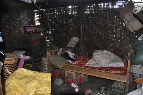 鎮領導帶著我們走進一座木屋,屋子里點了一堆火,有個小姑娘坐在火堆旁烤火。我在屋里繞了一圈,房間里陰冷陰冷的,墻邊對 頭放了兩張舊木床 ,床上堆了件沒罩被面的被子,幾件衣服零亂地掛在繩子上。幾縷陽光透過用竹子編成的墻,讓陰冷昏暗的屋子有了一點光亮和溫暖。不一會兒,一位 30 多歲的中年婦女走了進來,這大概就是女主人了。鎮領導招呼她坐下和我們聊一聊。
