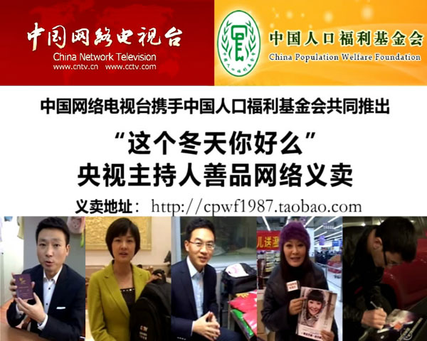 2011年春節期間,我會攜手央視網,舉行“這個冬天你好嗎”央視主持人善品網絡義賣。央視著名主持人郞詠淳、康輝、李小萌、魯健、王小騫捐出十余件個人物品,通過我會淘寶公益網站進行拍賣。該活動將從2月1日持續到2月8日,由網友自由競拍。所得善款將用于救助玉樹地區的受災孩子。敬請關注我會淘寶公益網店。http://cpwf1987.taobao.com