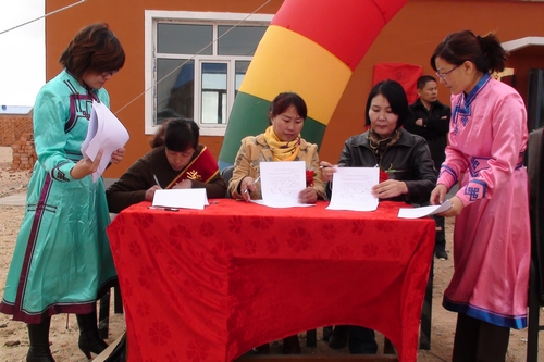 陳巴爾虎旗委、政府高度重視“幸福工程”項目的落實,成立了幸福工程項目領導小組,旗人口計生局、計生協會綜合考慮,認真討論,最終確定呼和諾爾鎮哈日干圖嘎查移民新村為“幸福工程”項目點。哈日干圖嘎查進行了認真調查摸底,選定了寧淑連等 20 位貧困母親為實施“幸福工程”項目資助對象,并建立了項目檔案,進行了公示。啟動儀式上,與受助對象簽訂了救助協議,為每戶發放項目啟動資金 10000 元。