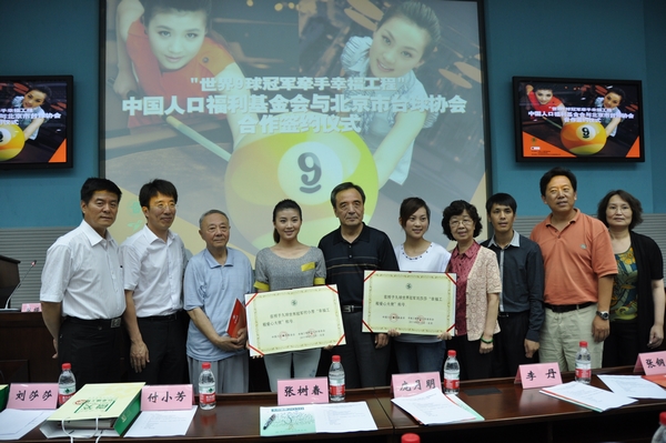 幫助困境母親,建設幸福家庭6 月22 日下午,“ 世界九球冠軍牽手幸福工程暨中國人口福利基金會與北京市臺球協會合作簽約儀式” 在北京舉行。中國人口福利基金會理事長趙炳禮,副理事長兼秘書長楊文莊,北京市體育局副局長、北京市臺協主席胡蓉,北京市政府原副秘書長、北京市臺協常務副主席朱祖樸,世界九球女子冠軍付小芳、劉莎莎出席了簽約儀式。