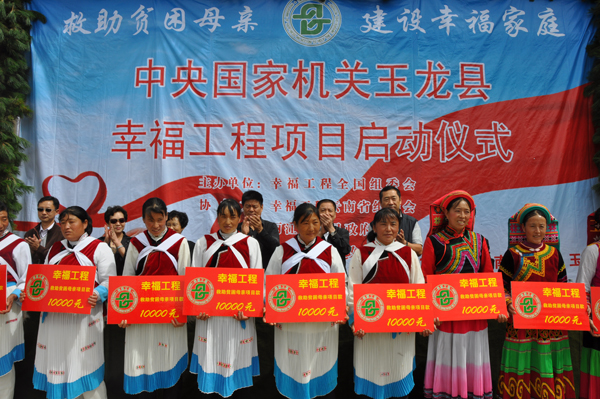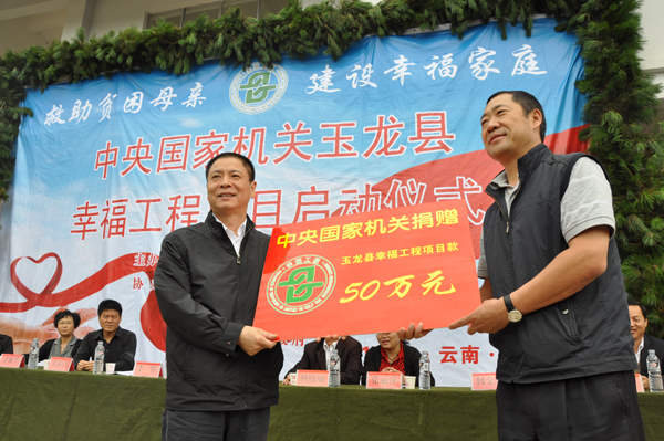 幫助困境母親,建設幸福家庭8月4日,我會理事李黎出席云南省玉龍縣幸福工程項目啟動儀式,并代表中央國家機關向玉龍縣白沙鄉捐贈 50 萬元。玉龍縣副縣長楊鶴亮、麗江市副市長馬駿嶺、云南省計生委副主任吳莉華先后代表縣、市、省講話,對中央國家機關領導的出席致以歡迎和謝意, 并表達了一定把善款管好、用好的決心。