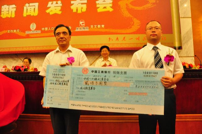中國人口福利基金會理事長趙炳禮接受龍文教育董事長楊勇捐贈的200萬元創始基金