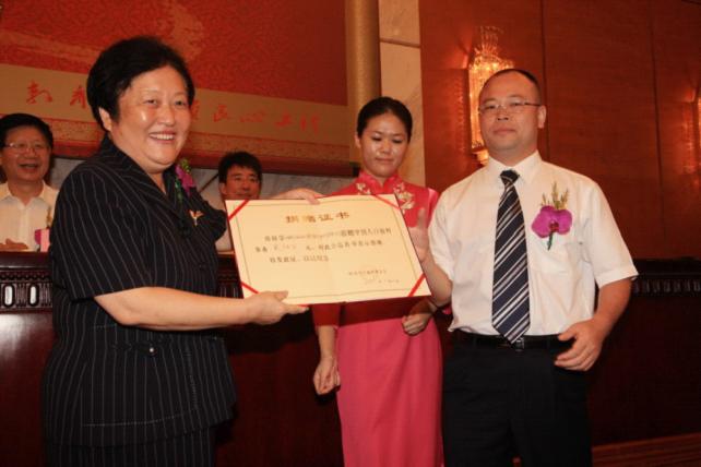國家人口和計劃生育委員會黨組副書記、副主任趙白鴿向龍文教育董事長楊勇頒發榮譽證書
