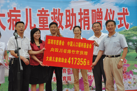 2011年9月8日,中國人口福利基金會與深圳市慈善會聯合開展的汶川地震重災區大病兒童救助項目在四川省德陽市綿竹市舉行捐贈儀式。中國人口福利基金會副秘書長藍野,深圳市慈善會專職副會長范建華,以及四川省人口和計劃生育委員會巡視員,四川省計劃生育協會秘書長曾慶梅,四川省德陽市人口計生委黨組書記、主任尹紅,四川省綿竹市人民政府副市長周毅等各級領導出席本次活動。