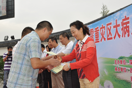 在綿竹舉行的捐贈儀式上,中國人口福利基金會與深圳市慈善會領導將捐贈牌交給當地領導,并在現場為受助代表發放救助金。