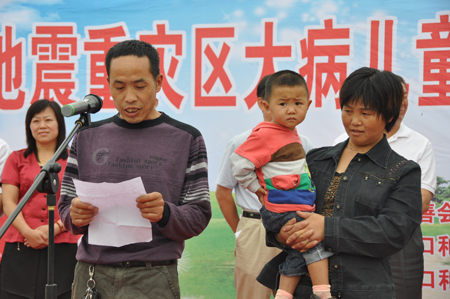 綿竹市興隆鎮靈橋村村民李顯洪19歲的女兒在汶川地震中不幸離世,在國家再生育政策之下,李顯洪夫婦于2009年8月再生育一子。正當他們從痛苦中走出來,沉浸在喜得愛子的喜悅中時,兒子被確診為復雜性心臟病,治療費用高達10萬余元。為給兒子治病,李顯洪家債臺高筑。令人慶幸的是,孩子的手術十分成功,以后可以像正常人一樣生活。但是,面對巨額債務,全家一籌莫展。大病兒童救助項目向李顯洪一家伸出了援助之手,他們在當地計生工作人員的幫助下,經過申請與審查,獲得2萬元救助金。李顯洪作為代表受助兒童家長發言,表達感激之情。