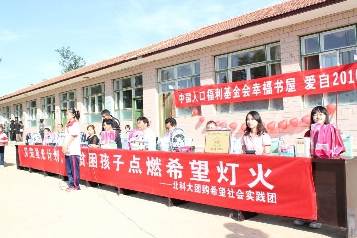 幫助困境母親,建設幸福家庭九月五日上午,北京科技大學“團購希望”社會實踐團來到張家口蔚縣馬寶玉小學舉行圖書捐贈儀式。實踐團捐贈了共計3296只筆,806本書。本次捐贈活動針對中國人口福利基金會“幸福書屋”公益項目。
