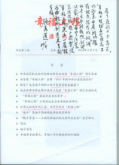幸福工程組委會主任顧秀蓮在收到今年第三期《幸福工程通訊》后,對近期“幸福工程”的工作給與了肯定并做出重要批示。她說:看到通訊十分高興,幸福工程組委會同志工作認真,開展活動很有張力,很有成效。調(diào)動各方面積極性,創(chuàng)新新載體,希望注意總結(jié)經(jīng)驗,推廣典型,使“幸福工程”更上一層樓。為母親們創(chuàng)造更多的幸福。