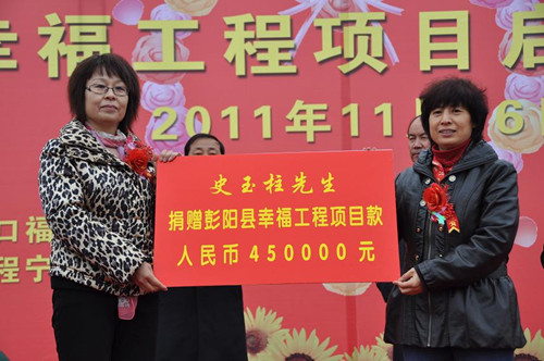 由史玉柱先生捐贈善款設立的彭陽縣“幸福工程”項目點于11月16日在新集鄉舉行了項目啟動儀式。中國人口福利基金會國內發展部副部長劉麗容,寧夏回族自治區計生委副主任白秀榮,計生協專職副會長兼秘書長張磊、副秘書長伊加強,固原市副市長田治富,彭陽縣委副書記李世明等出席了啟動儀式。
