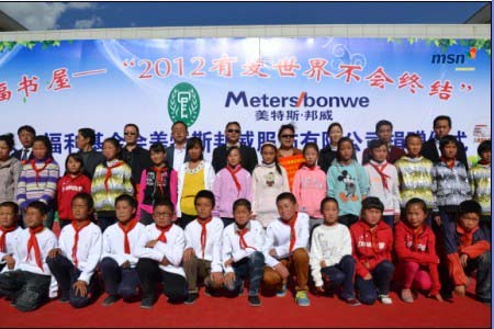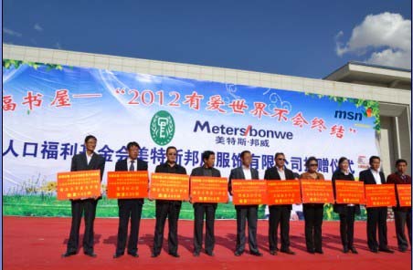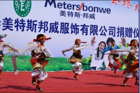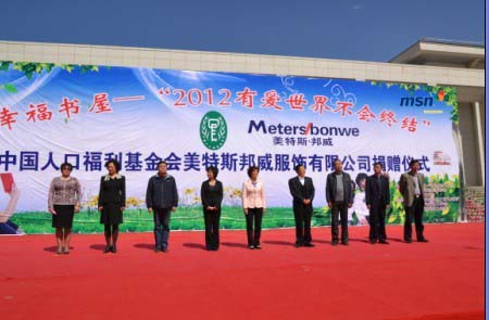 5月8日,在青海省人口計生委、計生協的協助之下,中國人口福利基金會在青海省格爾木市中心廣場舉行了“幸福書屋——2012有愛世界不會終結”美特斯邦威服飾有限公司100萬元服裝捐贈儀式。一共為格爾木市十一所學校的捐贈了7350件價值100萬元的衣服。
