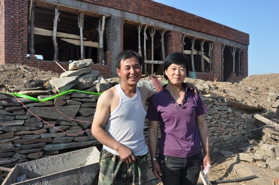 隨后,我們走訪了兩戶受助母親家庭。第一位母親叫白金鴿。到她家時,她和丈夫正在工地上干活蓋新房。而她住的那做老房,就一間房,確實破落不堪。在這間簡陋的房子里我們完成了簽約,并由老牛基金會的王瑞磊將 10000 元項目款交到她手中。我建議夫婦倆在還未蓋好的新房前合一張影。丈夫樂呵呵地將妻子摟在懷里,妻子靦腆地笑著,錢還攥在手中。兩人的笑容里透露著恩愛,還有對未來的信念與期許,很是動人。我想三年之后,這里的生活將是另一番光景。