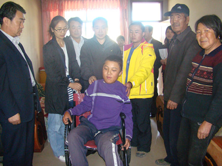 社會聯(lián)絡(luò)部部長宋宏云、“慈愛基金”代表閆斌、甘肅省計生協(xié)專職副會長等領(lǐng)導(dǎo)入戶發(fā)放輪椅剪影