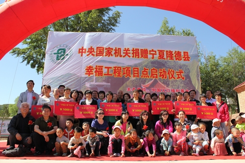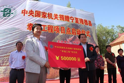 幫助困境母親,建設幸福家庭2012年6月16日,寧夏回族自治區固原市隆德縣幸福工程項目啟動儀式在隆德縣溫堡鄉老莊村舉行。中央國家機關二十三位捐贈代表,在國務院機關事務管理局陳占國副司長的帶領下,出席了項目啟動儀式,并將50萬元善款捐贈給當地100戶貧困母親家庭,幫助她們發展中藥材種植業。