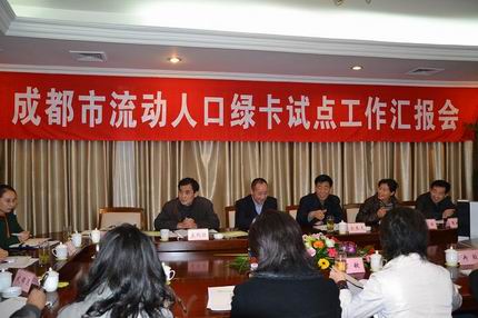 成都市人口計(jì)生委向四川省人口計(jì)生委副主任仝來龍、流管處副處長(zhǎng)學(xué)佳、政法處副處長(zhǎng)張地恩以及調(diào)研組匯報(bào)流動(dòng)人口試點(diǎn)工作