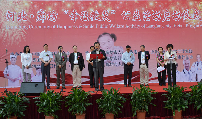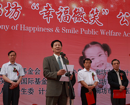 把幸福微笑送給每個兒童2011年5月23日,由中國人口福利基金會與美國微笑聯盟基金會聯合舉辦的“幸福微笑”——救助貧困家庭唇腭裂兒童活動在河北省廊坊市舉行啟動儀式。中國人口福利基金會理事長趙炳禮、國家人口計生委國合司對外聯絡處處長史遠明、中國人口福利基金會國際合作部部長李曉琳、河北省人口計生委、計生協領導,美國微笑聯盟基金會醫療隊全體成員,廊坊市人民政府有關領導,廊坊市人口計生委、計生協及有關部門負責人出席并參加了啟動儀式。趙柄禮理事長、史遠名處長等人為啟動儀式致辭。