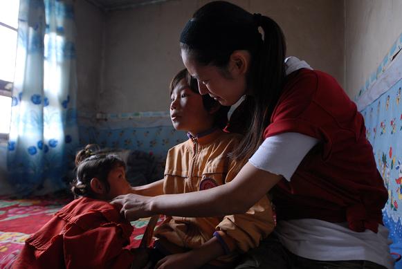 員,拿出捐贈(zèng)的衣服給她試穿時(shí),她還是抱著書包,不肯拿開。