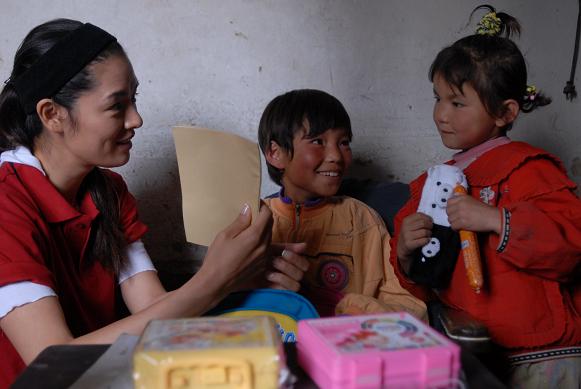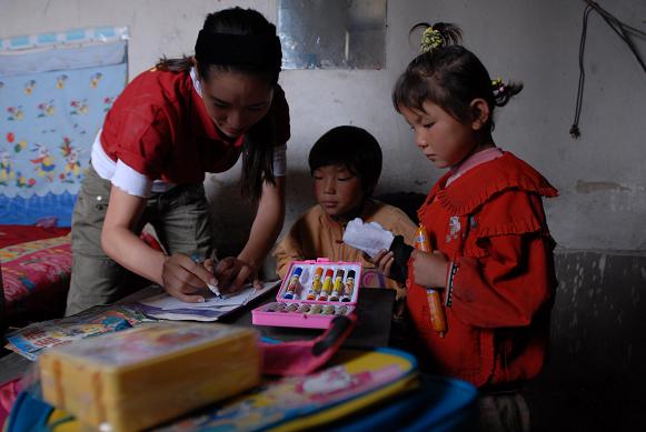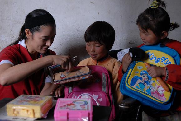 環(huán),就像一個(gè)親切的母親,在哄女兒睡覺(jué)一樣。故事講完后,馬艷麗拿出了預(yù)先準(zhǔn)備好的水彩筆,書包,本和文具盒。小妹妹拿著書包,一直不肯放下。當(dāng)工作人