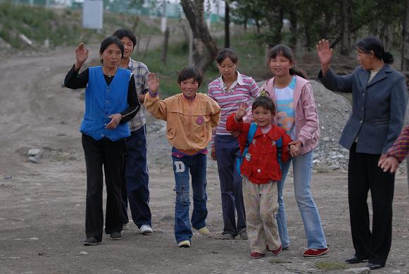 圖十三:兩個(gè)懂事的孩子向好心人揮手致意