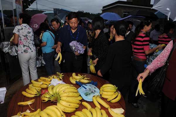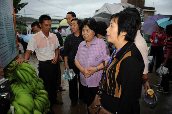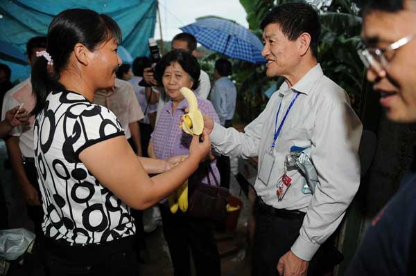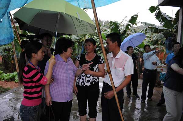 11月8日下午,出席幸福工程經驗交流會的會議代表考察了福建漳州市長泰縣受助母親楊紅英的香蕉種植園。圖片說明:1.代表們品嘗楊紅英的幸福成果2.楊紅英向代表介紹自己的脫貧情況和香蕉種植情況3.楊紅英的丈夫向代表們講述自家的生產生活情況4.幸福工程組委會副主任吳景春鼓勵她繼續努力