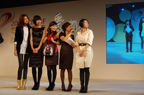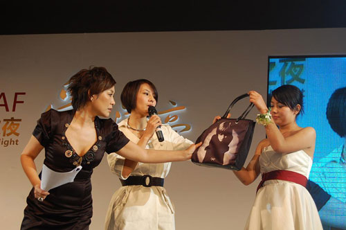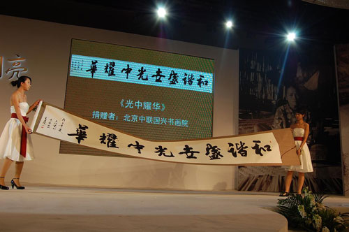 1.高圓圓捐贈印有其肖像的環保手提袋2.《美麗俏佳人》主持人以3.5萬元拍得手提袋3.北京中聯國興書畫院捐贈的畫作《群賢雅聚》拍得4.4萬元4.北京中聯國興書畫院捐贈的書法《和諧盛世光中耀華》拍得3萬元