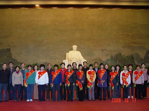 母親代表參觀毛主席紀念堂圖一:母親代表向毛主席塑像獻花圖二:母親代表向毛主塑像默哀圖三:母親代表在毛主席塑像前合影留念