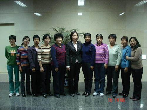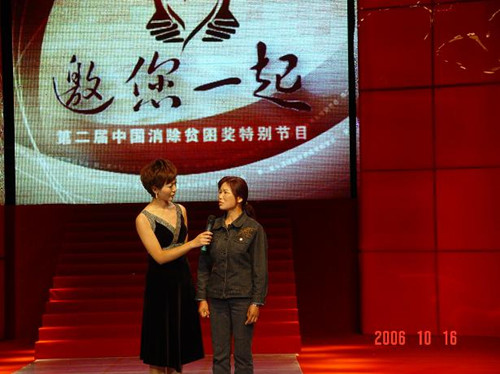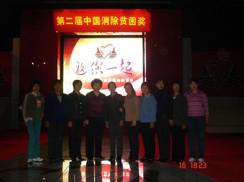 2006年10月16日晚十位母親代表參加中國第二屆消貧獎頒獎大會圖一:母親代表與王光美女兒劉亭合影圖二:十位母親代表在第二屆消除貧困獎大會上合影圖三:侯銀花代表幸福工程受助母親在大會上發(fā)言