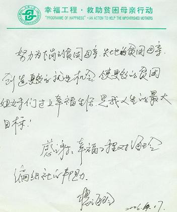 “點(diǎn)滴之恩當(dāng)涌泉相報(bào)”!我知道我能有今天的一切,是幸福工程這盞幸福的燈為我導(dǎo)航,讓我不懼風(fēng)險(xiǎn)。于是,成就“幸福工程事業(yè)”成了我另一個(gè)夢(mèng)想,這個(gè)夢(mèng)想是一個(gè)彩色的夢(mèng)想,因?yàn)樗休d著民族的希望,這個(gè)夢(mèng)想是幸福的夢(mèng)想,因?yàn)樗屒f萬個(gè)母親和她們的孩子不再貧窮。