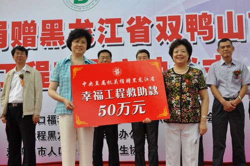 幫助困境母親,建設幸福家庭8月1日,中央直屬機關捐贈黑龍江省雙鴨山市幸福工程項目啟動儀式在黑龍江省雙鴨山市嶺東區舉行。中央直屬機關人口計生委專職副主任、我會監事石穎波,中央直屬機關十個部委捐贈代表,我會副秘書長葛振江、國內發展部部長劉麗容,黑龍江省人口計生委巡視員、計生協常務副會長肖麗華,雙鴨山市市委常委張振偉,雙 鴨山市人口計生委主任于桂平,嶺東區區委副書記馮海軍等領導及受助母親代表參加啟動儀式。