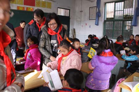 最后出席捐贈儀式的領(lǐng)導(dǎo)和嘉賓向?qū)W生們發(fā)放了書包文具和圖書,并參觀了校園。