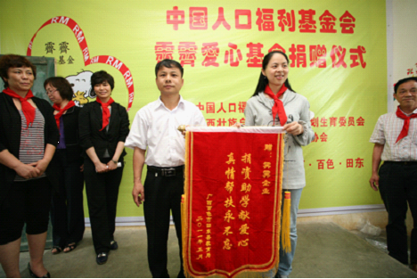 捐贈儀式于5月12日下午在百色市田東縣林逢鎮東往小學舉行。中國人口福利基金會項目管理部部長牛艷平、霽霽企業代表陳穎、廣西計生協龐弶副秘書長、百色市人口計生委副主任韋玉清及田東縣人民政府調研員陸照典等當地領導共同出席了捐贈儀式。