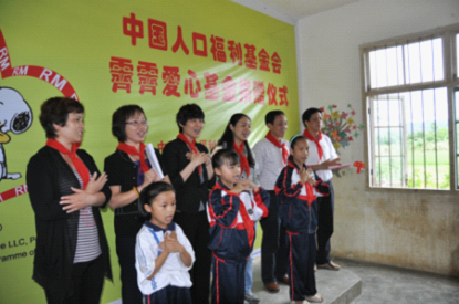 霽霽企業總經理助理陳穎女士代表霽霽愛心基金創始人莫淵策先生及夫人和霽霽企業向中國人口福利基金會的大力協助表示由衷的感謝,并激勵學生們說:“同學們手上拿著的書包上印著的這只小狗叫做Snoopy,他雖然也遇到過許多的挫折,卻從未放棄自己的理想,生活也因為有了這些追求而充滿快樂。我相信,只要擁抱夢想,不斷奮斗,你們也一定能找到快樂的真正意義。”