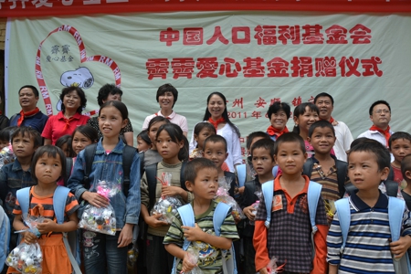 此次中國人口福利基金會霽霽愛心基金貴州之行共向貴州省11所小學捐助了愛心課桌椅1500套、書包文具1500套,史努比玩具公仔1500套。