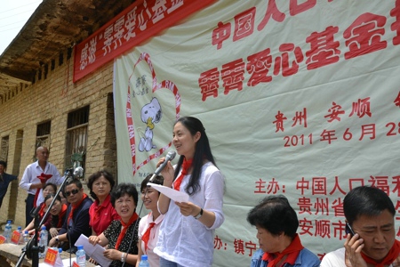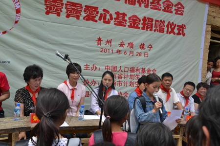 News2011年6月28日下午13時,中國人口福利基金會牛艷平部長、霽霽企業總經理助理陳穎女士在貴州省計生協項目部部長王理春、及當地計生協及政府領導嘉賓的陪同下,在七一建黨90周年到來之際,共同出席了在貴州省安順市鎮寧縣達布小學舉行的中國人口福利基金會霽霽愛心基金捐贈儀式。